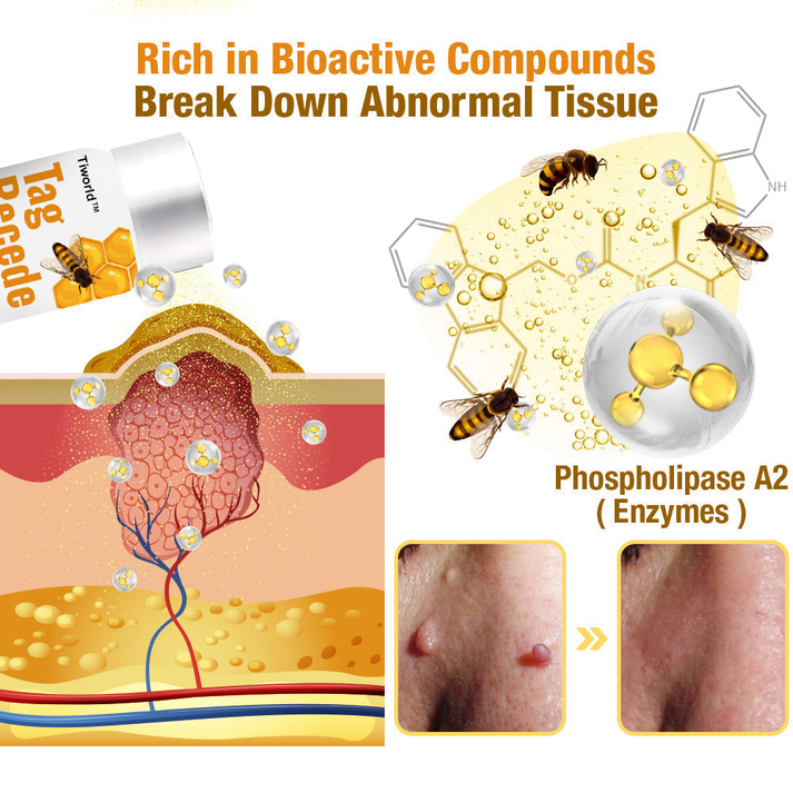 El veneno de abeja contiene varios compuestos bioactivos, entre ellos la melitina, la apamina y la adolapina, que se ha demostrado científicamente que combaten las verrugas o acrocordones de forma eficaz . Entre su arsenal de enzimas, la fosfolipasa A2 destaca por su capacidad para descomponer el tejido anormal , simplificando el proceso de eliminación de verrugas o acrocordones